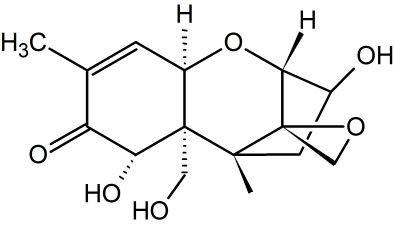 嘔吐毒素主體成分為DON(deoxynivalenol, 脫氧雪腐鐮刀菌烯醇),屬于單端孢霉烯族化合物,主要由禾谷鐮刀菌、尖孢鐮刀菌、串珠鐮刀菌、擬枝孢鐮刀菌、粉紅鐮刀菌、雪腐鐮刀菌等鐮刀菌產(chǎn)生。另外,頭孢菌屬、漆班菌屬、木霉屬等的菌株都可產(chǎn)生該毒素。單端孢霉烯族毒素共有150多種,是一類強有力免疫抑制劑,所引起典型癥狀是采食量降低,所以這類毒素又叫飼料拒食毒素。嘔吐毒素(DON)是其中最重要一種毒素,主要來自鐮刀菌屬(Fusarium),尤其是禾谷鐮刀菌(Fusariumgraminearum)和黃色鐮刀菌(Fusarium culmorum)。由于它可以引起豬的嘔吐,故又名嘔吐毒素(vomitoxin,VT)。由于它可以引起豬的嘔吐而得名,對人體有一定危害作用,歐盟分類標準為三級致癌物。