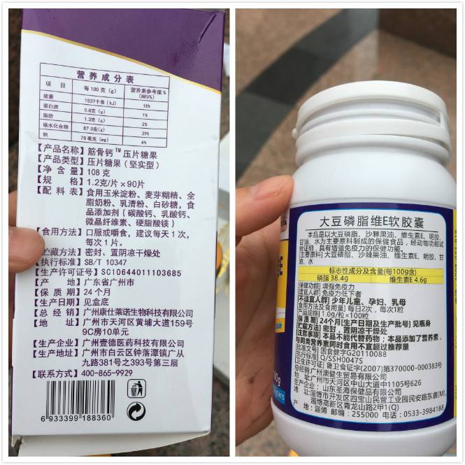 紅星新聞記者查看了一下“藥品”的成分,如筋骨鈣壓片糖果,配料是食用玉米淀粉、麥芽糊精、全脂奶粉等;小分子膠原蛋白肽固體飲料,配料是膠原蛋白、海洋魚低聚肽粉等;貝貝·高樂配料是陳皮、麥芽、葡萄糖酸鈣,還有維生素等,大部分屬于保健品,功能是增強免疫力。