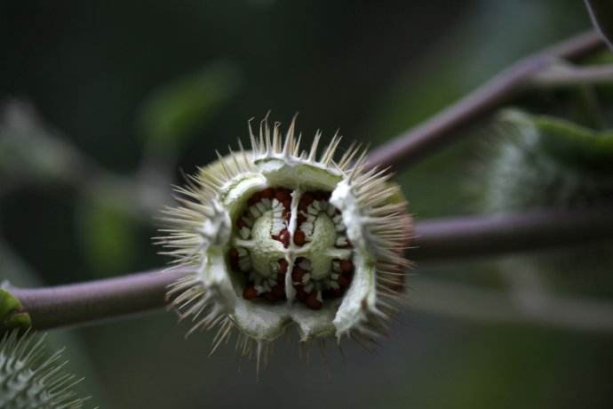 白色的小喇叭花瓣,種子是帶刺的綠色小球球,在曼陀羅美麗可愛的外表下,卻是致命的危險。西安幾乎每年都有曼陀羅中毒病例發生,有人把它當野菜涼拌食用,有人覺得好奇嘗果子,結果都導致中毒,提醒大家不要隨意采摘食用不知名的野菜、野果。