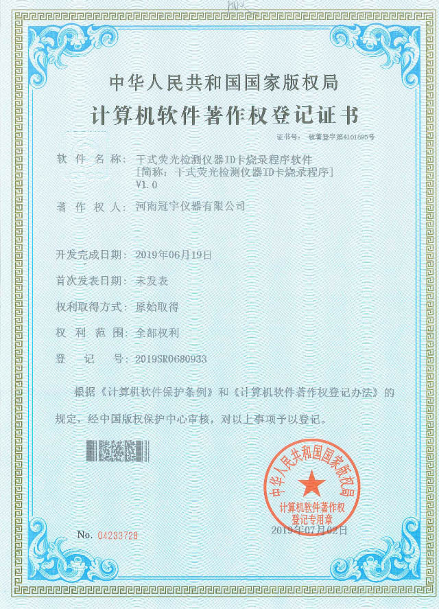 近日,河南冠宇儀器有限公司(以下簡稱:冠宇儀器)繼之前的多項(xiàng)軟件著作權(quán)證書及專利證書之后,又獲由中華人民共和國國家版權(quán)局頒發(fā)的一項(xiàng)“干式熒光檢測(cè)儀器ID卡燒錄程序計(jì)算機(jī)軟件著作權(quán)登記證書”,一系列的權(quán)威肯定,彰顯了冠宇儀器強(qiáng)大的技術(shù)研發(fā)能力,也體現(xiàn)出公司為客戶提供優(yōu)質(zhì)產(chǎn)品的強(qiáng)大決心。