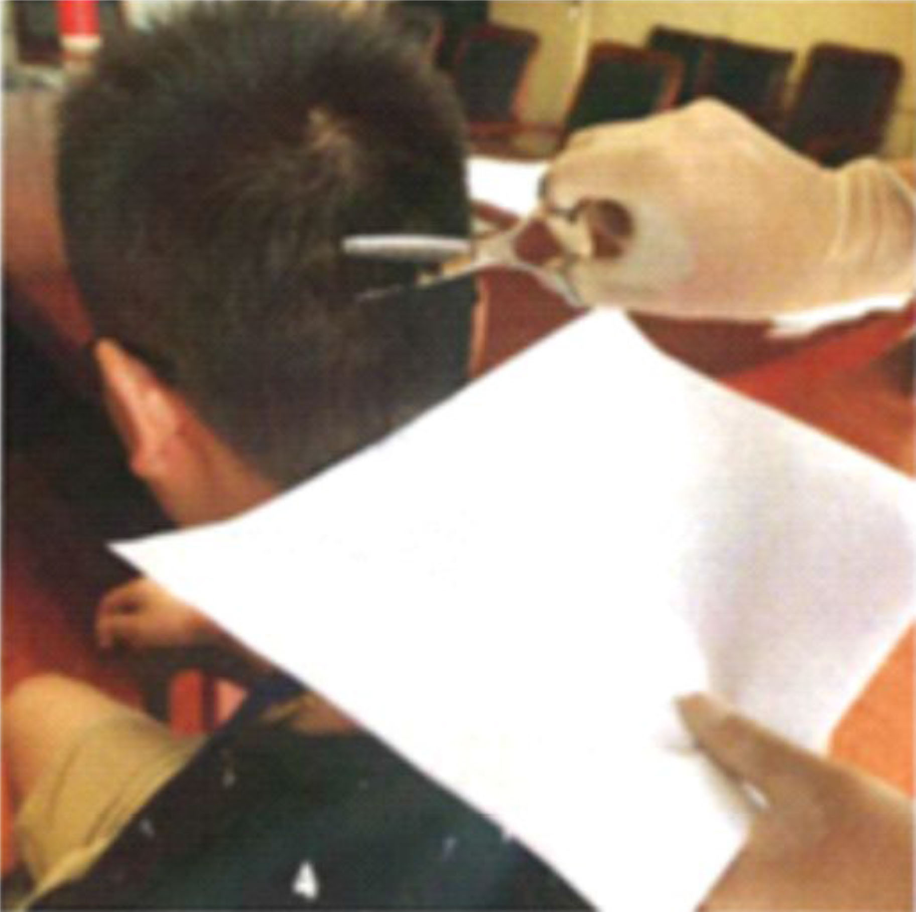 工作人員應當佩戴一次性手套,使用醫用剪刀或者鋸齒剪刀緊貼被提取人員頭皮表面剪取頭頂后部(如頭頂后部無法提取到足夠頭發的,可選擇離該部位最近的頭部部位)長度為3厘米以內的頭發;長于3厘米的頭發,需從發根端截取3厘米。