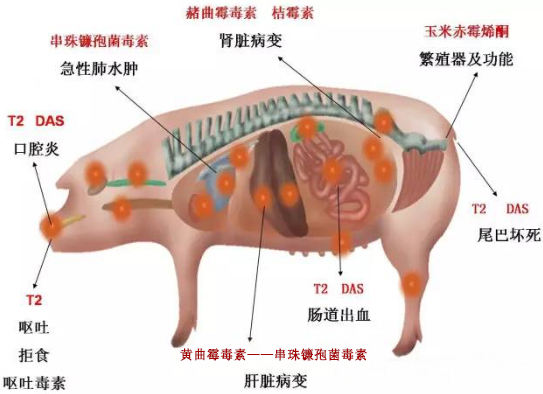 今年自入秋以來,尤其華北地區,接連不斷的降雨,將嚴重影響今年的秋收和秋種,玉米作為主產區之一,對于其收獲和晾曬收藏嚴重受到影響,玉米質量也隨之下降,嚴重營養著養殖企業的飼料安全情況。其次長期的潮濕會對養殖行業的環境、飼料帶來受潮、發霉的危害。說起霉菌毒素首先想到玉米,其次還有豆粕、麩皮、小麥、魚粉等原料在一定條件下均可產生霉菌毒素。霉菌毒素對養豬行業造成的危害是十分巨大的,一旦豬群收到了霉菌毒素的污染,那么各種疾病的發病率就會節節攀升,像我們已知的藍耳病、 圓環病毒、偽狂犬病、豬瘟、衣原體病、弓紅蟲病等經常困擾。同時還會破壞豬的機體器官,造成腸道受損,肝臟損壞等疾病, 而且同時母豬的生產能力也會下降、幼崽發病率提高,采食量下降或者拒食,導致豬群生長緩慢,飼料報酬降低,瘦肉率也大大降低。 豬群免疫力直線下降:疫苗的保護力大大降低,豬群交叉感染及其嚴重,藥物治療效果差,豬群的死亡率大大增加。