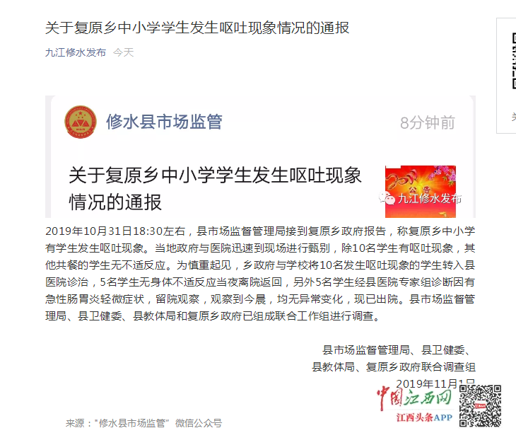11月1日上午,修水縣市場監管局管理局發布通報稱,2019年10月31日18:30左右,縣市場監督管理局接到復原鄉政府報告,稱復原鄉中小學有學生發生嘔吐現象。當地政府與醫院迅速到現場進行甄別,除10名學生有嘔吐現象,其他共餐的學生無不適反應。為慎重起見,鄉政府與學校將10名發生嘔吐現象的學生轉入縣醫院診治,5名學生無身體不適反應當夜離院返回,另外5名學生經縣醫院專家組診斷因有急性腸胃炎輕微癥狀,留院觀察,觀察到今晨,均無異常變化,現已出院。縣市場監督管理局、縣衛健委、縣教體局和復原鄉政府已組成聯合工作組進行調查。