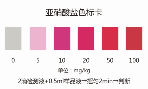2.2:若檢測管顏色為黃色或者無色,說明不含有亞硝酸鹽。空白對照管為試劑本色或無色。(詳見色卡)
