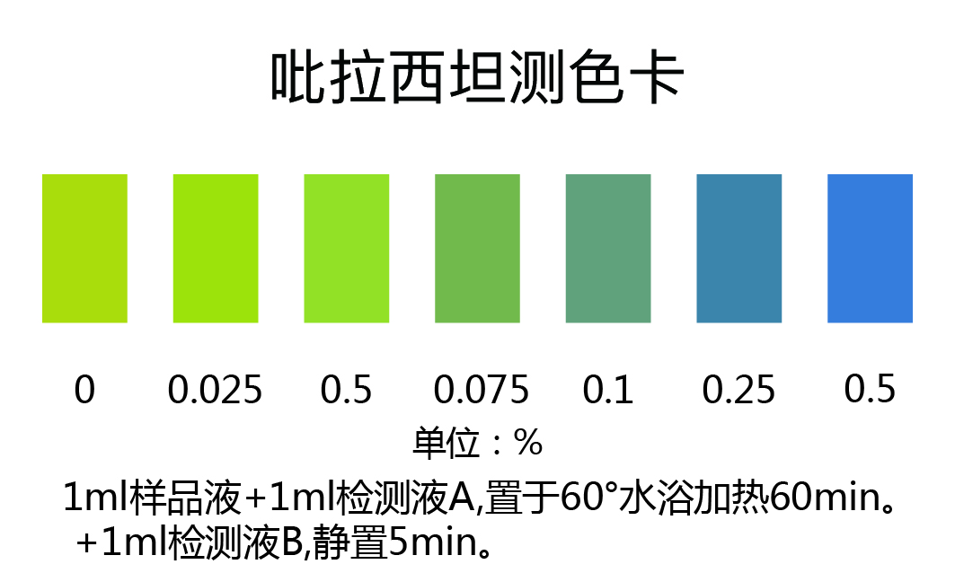 取上述濾液0.5 ml于玻璃比色皿或試管中,加入0.5 ml檢測(cè)液A,置于60°C水浴加熱60min,加入0.5 ml檢測(cè)液B,靜置5min,對(duì)照色卡比色,吡拉西坦含量越高,顏色越深;