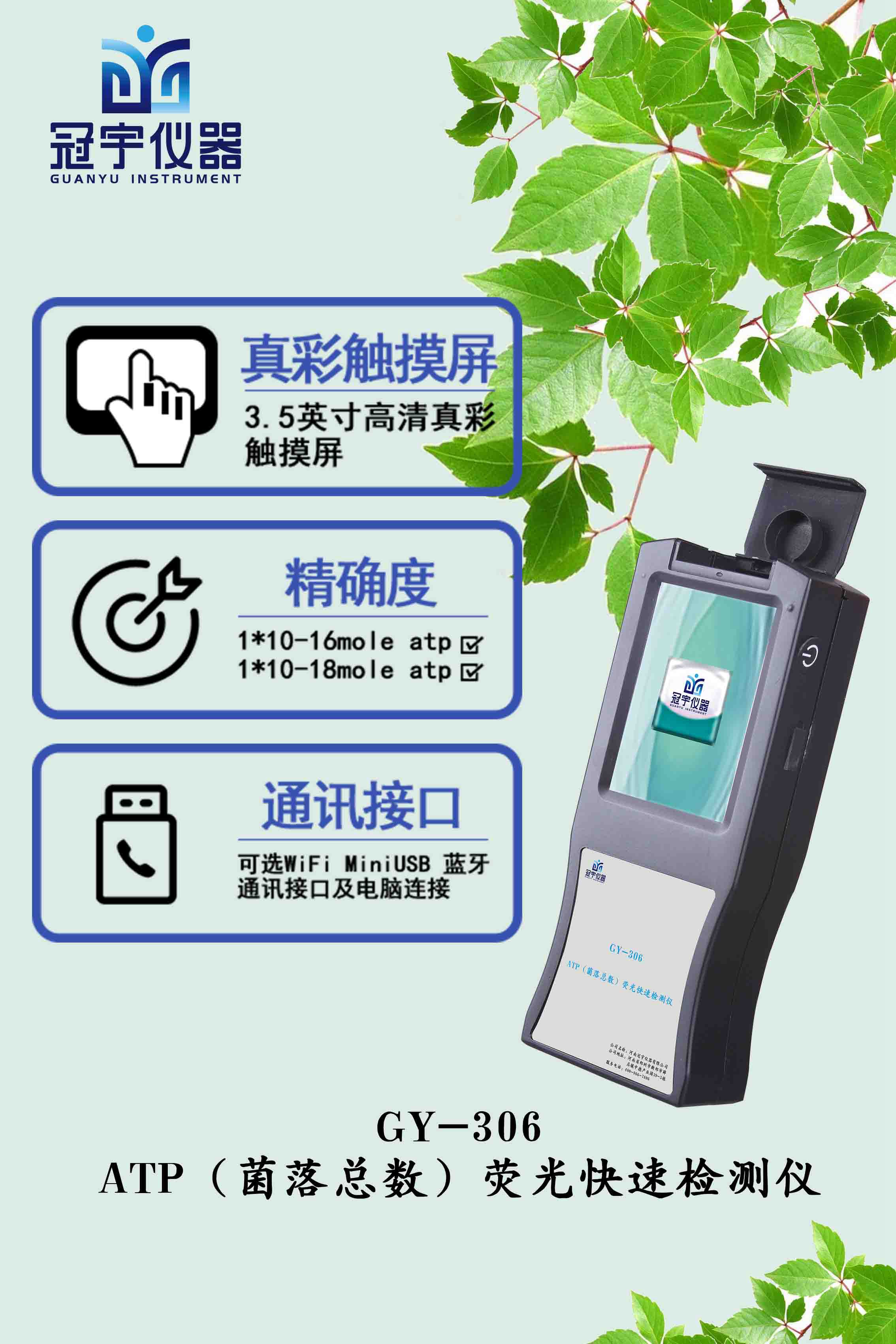 ATP熒光檢測儀GY-306ATP熒光快速檢測儀是河南冠宇儀器有限公司基于螢火蟲發光原理,利用“熒光素酶—熒光素體系”研制而成;ATP(Adenosine Triphosphate)中文名字是三磷酸腺苷。ATP是已知的各種生命活動能量的直接來源,因為在地球上的動植物細胞、細菌和食物殘渣中只要有生命的地方都含有ATP即三磷酸腺苷。由于所有生物活細胞中含有恒量的ATP,所以ATP含量可以清晰地表明樣品中微生物與其他生物殘余的多少,ATP熒光檢測儀適用于食品、飲用水中微生物快速檢測,餐具潔凈度快速檢測,食品加工器具、工作臺面、餐飲器具等消毒結果快速檢測,醫療環境工作平臺即時評估。