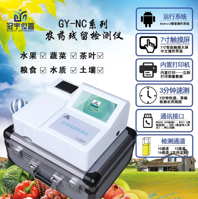 河南冠宇儀器有限公司生產農藥含量檢測儀三分鐘檢測農藥殘留含量,農藥含量檢測儀三分鐘快速檢測檢測蔬菜、水果、糧食、茶葉以及土壤中有機磷和氨基甲酸脂類農藥殘留的快速檢測;廣泛應用于各級政府蔬菜檢測中心、農貿市場、超市、環保機構、蔬菜種植基地、飯店、車載及實驗室等食品安全檢測與監控場所等單位農藥殘留的檢測。