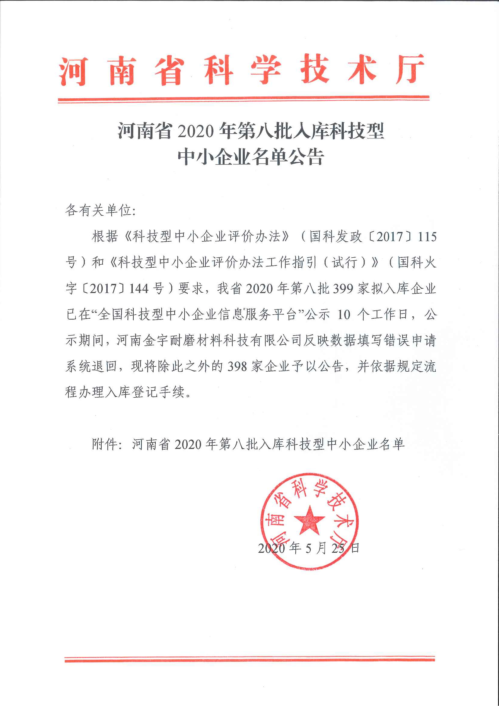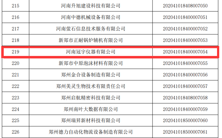 根據《科技型中小企業評價辦法》(國科發政〔2017〕115號)評價指標要求,國家科技部火炬中心《關于組織開展2020年科技型中小企業評價工作的通知》(國科火字〔2020〕44號),認定河南冠宇儀器有限公司成為“國家科技型中小企業”,并獲得榮譽稱號,編號為:202041018400007054。