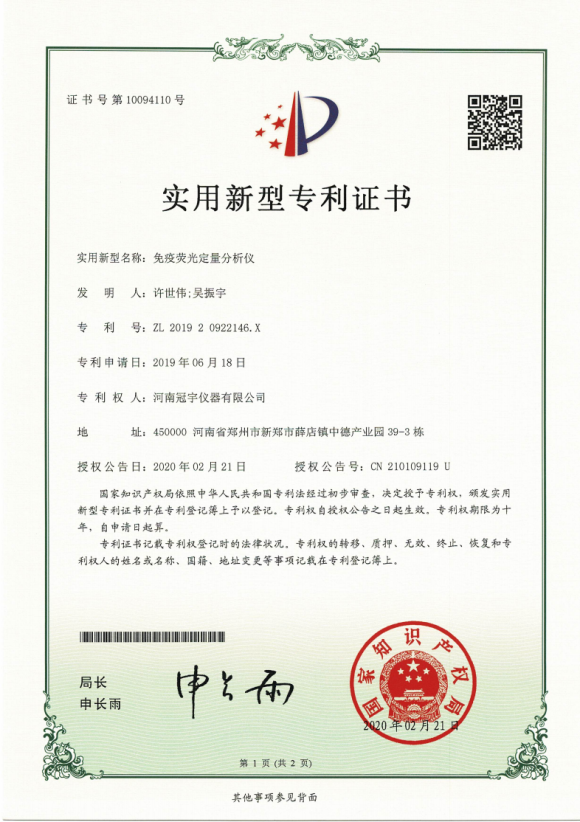 近日,河南冠宇儀器有限公司(以下簡(jiǎn)稱:冠宇儀器)繼之前的多項(xiàng)軟件著作權(quán)證書及專利證書之后,又獲由中華人民共和國(guó)國(guó)家版權(quán)局頒發(fā)的一項(xiàng)“免疫熒光定量分析儀實(shí)用新型專利證書”,一系列的權(quán)威肯定,彰顯了冠宇儀器強(qiáng)大的技術(shù)研發(fā)能力,也體現(xiàn)出公司為客戶提供優(yōu)質(zhì)產(chǎn)品的強(qiáng)大決心。