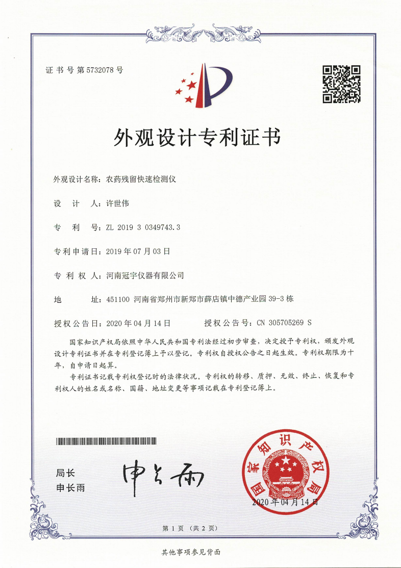 近日,河南冠宇儀器有限公司(以下簡稱:冠宇儀器)繼之前的多項軟件著作權證書及專利證書之后,又獲由國家知識產權局頒發的一項“農藥殘留快速檢測儀外觀設計專利證書”,一系列的權威肯定,彰顯了冠宇儀器強大的技術研發能力,也體現出公司為客戶提供優質產品的強大決心。