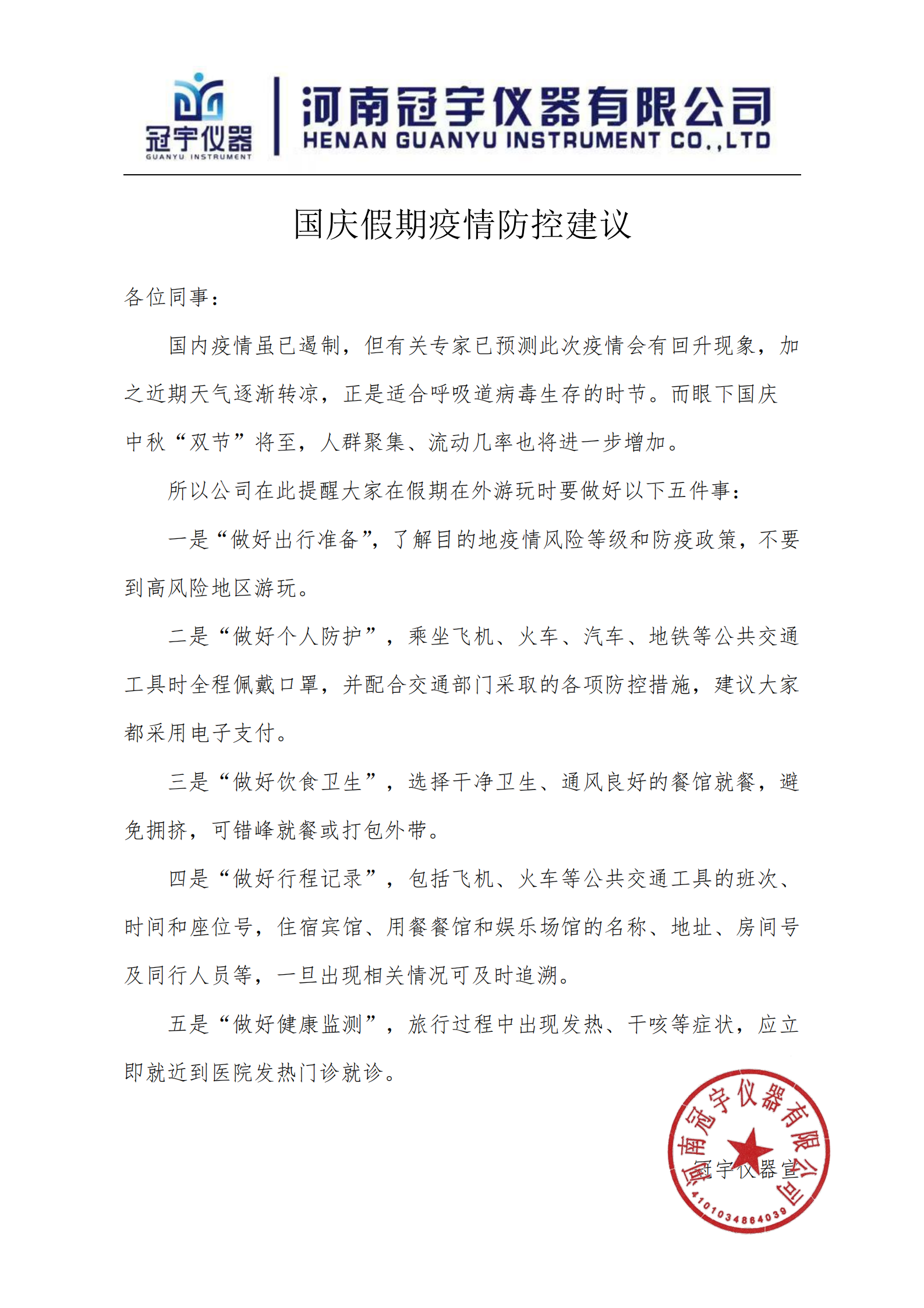 國慶長假即將臨近,冠宇儀器在這里提一些疫情防控建議希望能夠?qū)δ兴鶐椭?/span>