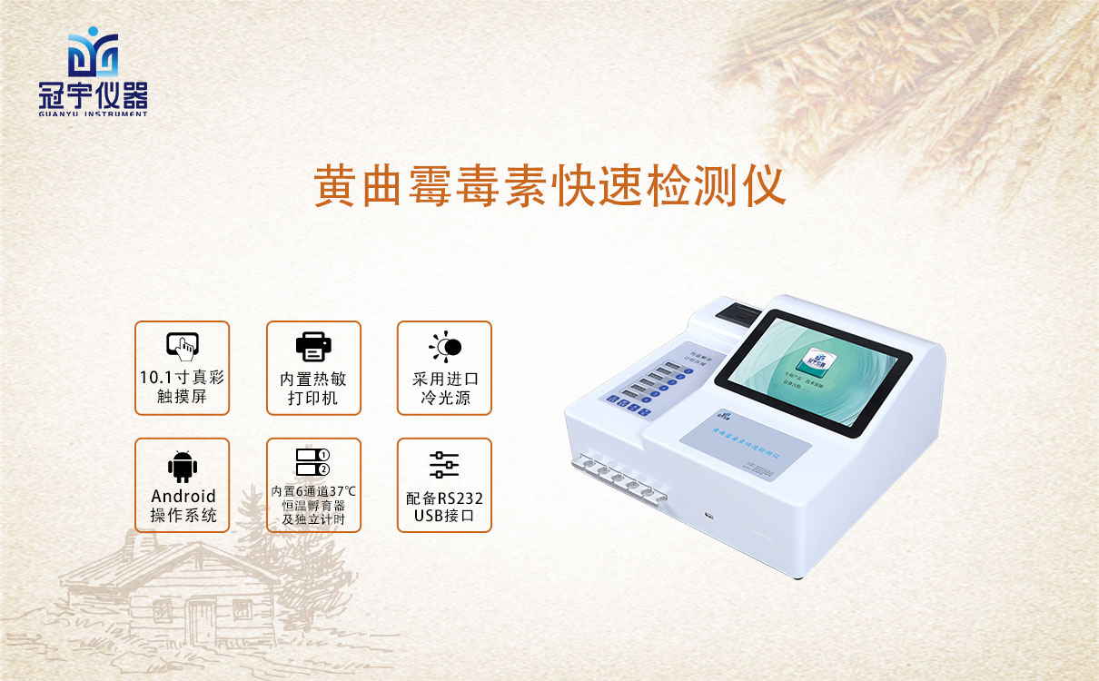 冠宇儀器黃曲霉毒素快速測試儀能夠快速定量檢測玉米、小麥、大米、大麥、小米和燕麥等谷物、飼料、面粉、食用油、調味品中黃曲霉毒素B1,適用于糧庫收糧檢測、糧油監測中心、糧油飼料生產加工、食品加工貿易、畜禽養殖戶自查、工商質監部門用于市場快速篩查等。