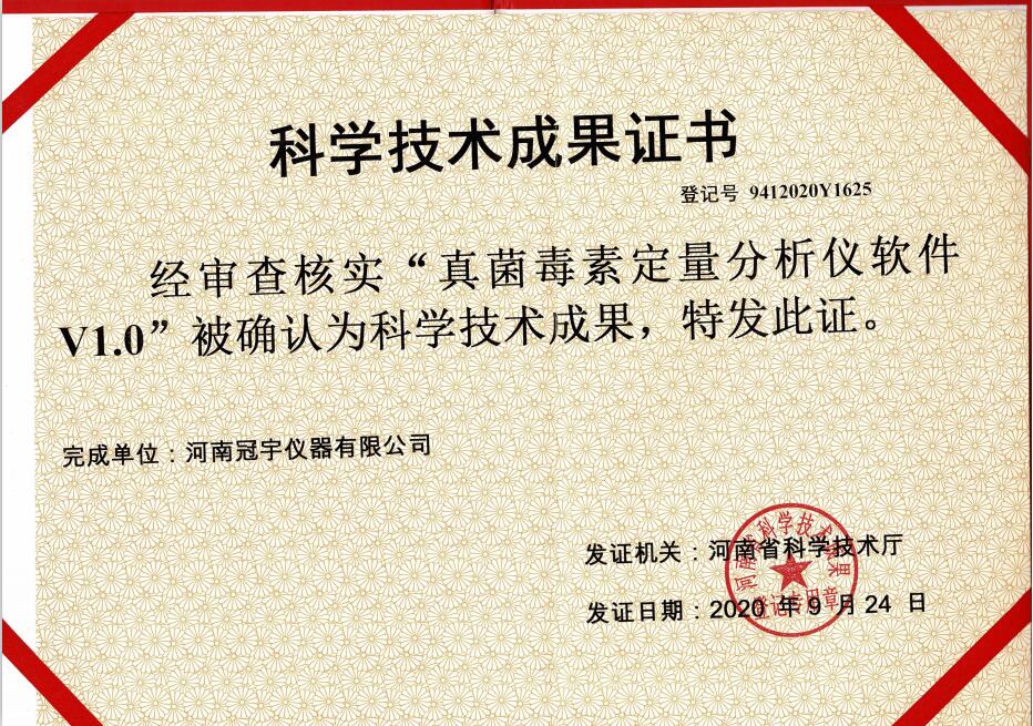 河南冠宇儀器有限公司(以下簡稱:冠宇儀器)繼多項軟件著作權證書、實用新型專利證書、計算機軟件著作權等一系列證書之后,又獲由河南省科學技術廳頒發的一項“真菌毒素定量分析儀軟件V1.0科學技術成果證書”,一系列的權威肯定,彰顯了冠宇儀器強大的技術研發能力,也體現出公司為客戶提供優質產品的強大決心。