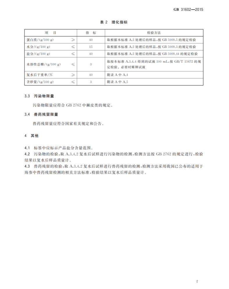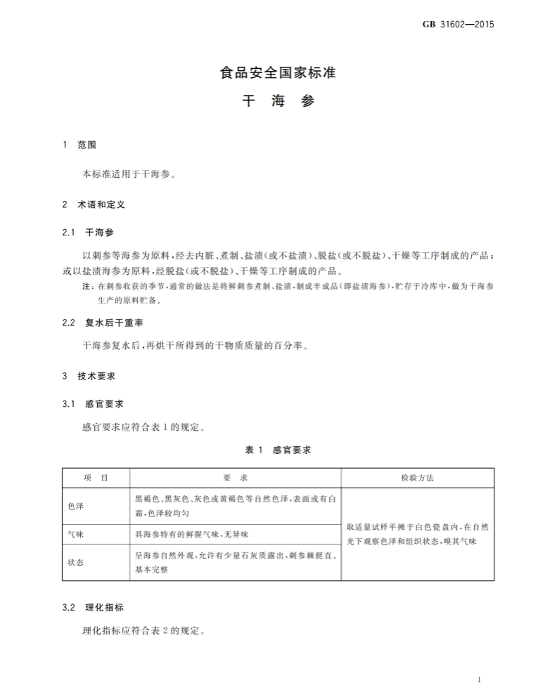 GB 31602-2015 食品安全國家標準 干海參之感官要求及理化指標