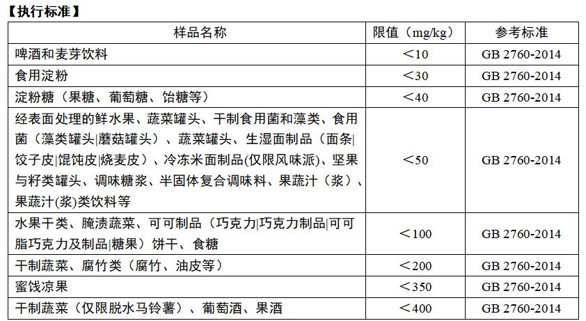 為保證消費者健康,我國在食品添加劑標準中規定了二氧化硫類物質在食品中的使用范圍、使用量及允許最大殘留量。