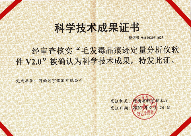 河南冠宇儀器有限公司(以下簡稱:冠宇儀器)繼多項軟件著作權證書、實用新型專利證書、計算機軟件著作權等一系列證書之后,又獲由河南省科學技術廳頒發的一項“毛發毒品痕跡定量分析與軟件V2.0科學技術成果證書”,一系列的權威肯定,彰顯了冠宇儀器強大的技術研發能力,也體現出公司為客戶提供優質產品的強大決心。