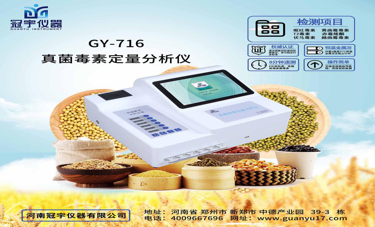 綜上,真菌毒素對人們的危害不容忽視,要加強相應的監管檢控工作,冠宇儀器GY-710真菌毒素殘留定量分析儀應用競爭抑制免疫層析的原理,通過檢測線熒光定量卡中的熒光強弱程度,定量分析待檢樣品中真菌毒素殘留含量。真菌毒素快速檢測儀能夠快速定量檢測糧食、飼料、谷物、食用油、調味品等食品中T2毒素、嘔吐毒素、赭曲霉毒素、伏馬毒素、玉米赤霉烯酮,真菌毒素殘留定量分析儀適用于糧油監測中心、糧油飼料生產加工、食品加工貿易、畜禽養殖戶自查、工商質監部門用于市場快速篩查等。