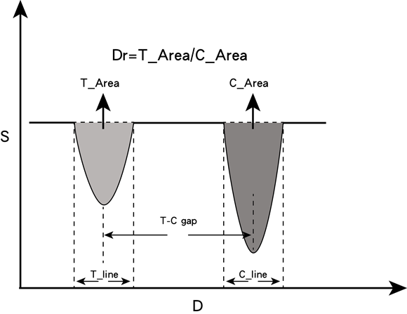 Dr值:通過(guò)光學(xué)傳感器獲得的信號(hào)曲線上T線對(duì)應(yīng)峰面積(T_Area)與C線對(duì)應(yīng)峰面積(C_Area)之比值。即:Dr值 = T_Area/C_Area,如圖2所示,為從儀器上獲得的信號(hào)曲線的對(duì)應(yīng)關(guān)系。用標(biāo)準(zhǔn)條帶S0、S1、S2和S3檢測(cè),記錄顯示屏顯示的Dr值。