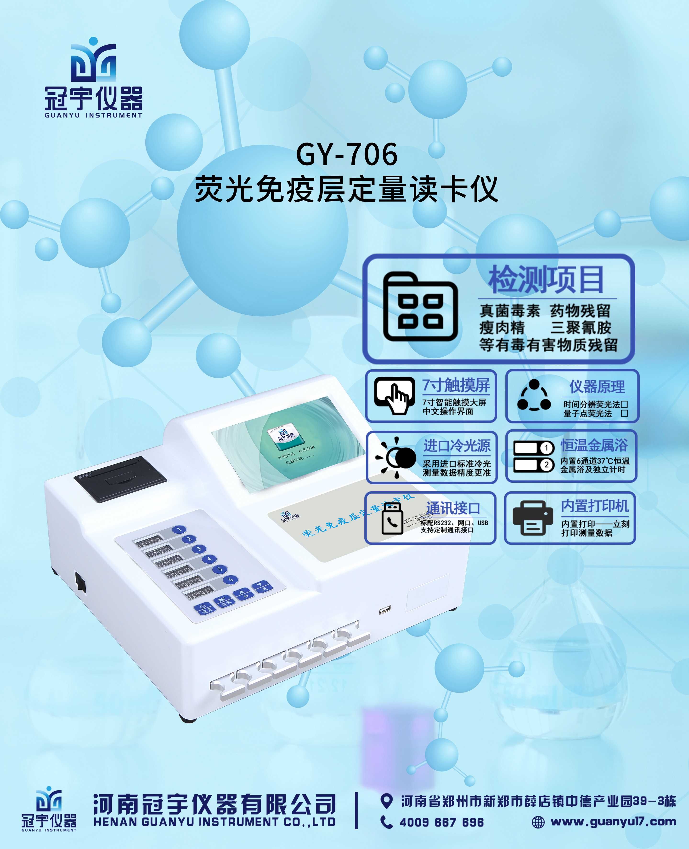 量子點熒光定量分析儀GY-706量子點熒光定量分儀應(yīng)用競爭抑制免疫層析的原理,通過檢測線熒光定量卡中的熒光強弱程度,定量分析量子點熒光法制成的真菌毒素、獸藥、瘦肉精、抗生素、動物疫病、農(nóng)藥殘留、臨床檢查項目、等有毒有害物質(zhì)殘留