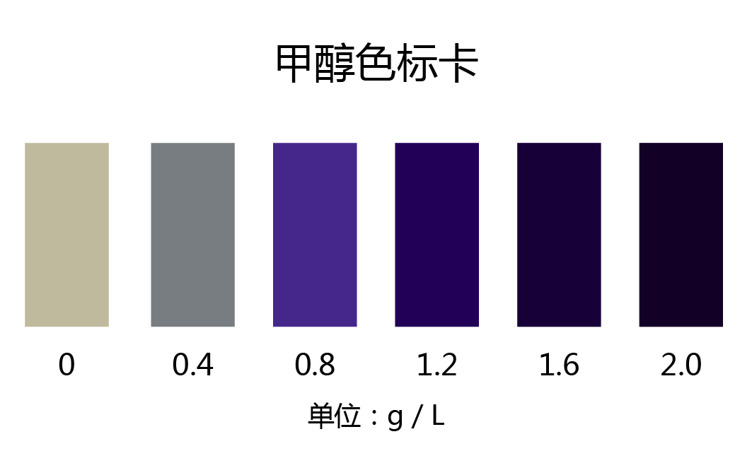 2.1:20分鐘后觀察孔中顏色的深淺,顏色越深,表示酒樣中甲醇的含量越高;(對照色卡上的標示值可知酒樣中甲醇的大致含量)