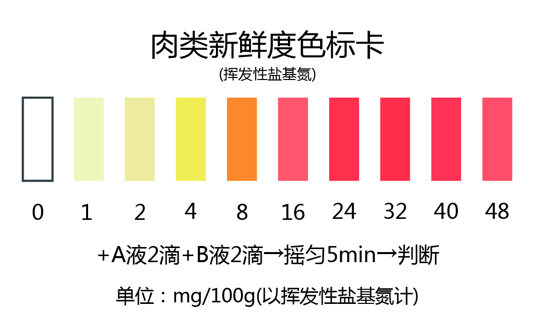 比色卡為每100g肉品中揮發性鹽基氮的大致含量,可根據下列指標確定肉品的新鮮度:
